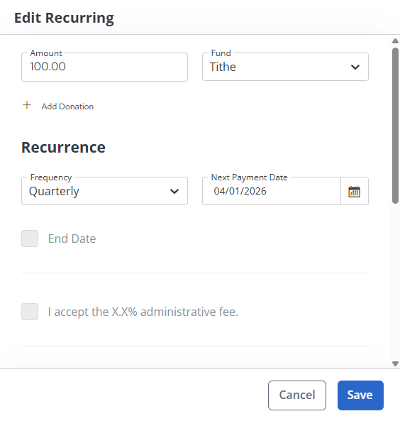 2. Click the Edit button to edit the Amount, Fund, Frequency, Next Payment/End Date, or whether you would like to cover the administrative fee.
