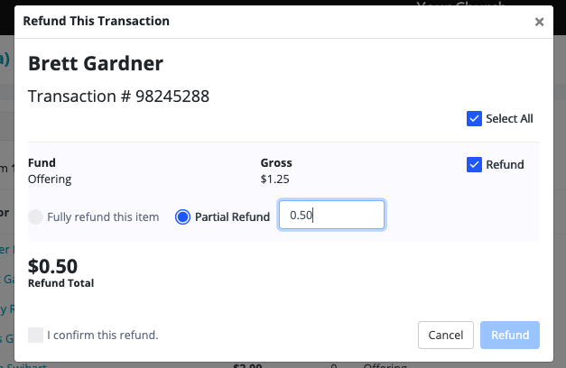 - The full transaction amount will be credited back to the giver’s payment source, or you can opt for a partial refund.Â