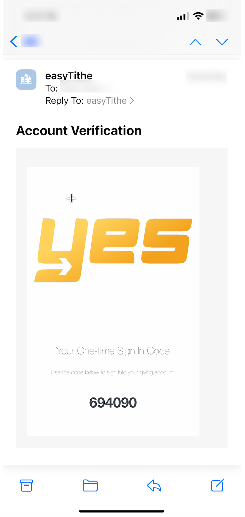 Check Spam/Junk, verify the email entered, wait 1–2 minutes, then tap Resend Code. If it still doesn’t arrive, sign in with your password or contact your church.
