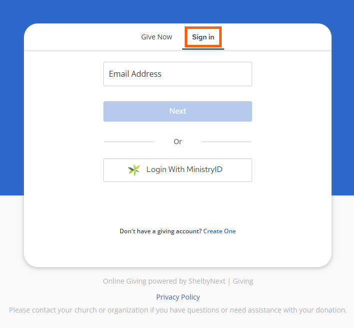 On your church's website, navigate to the online giving page. Click Sign In. Sign in with either your email address or Ministry ID.