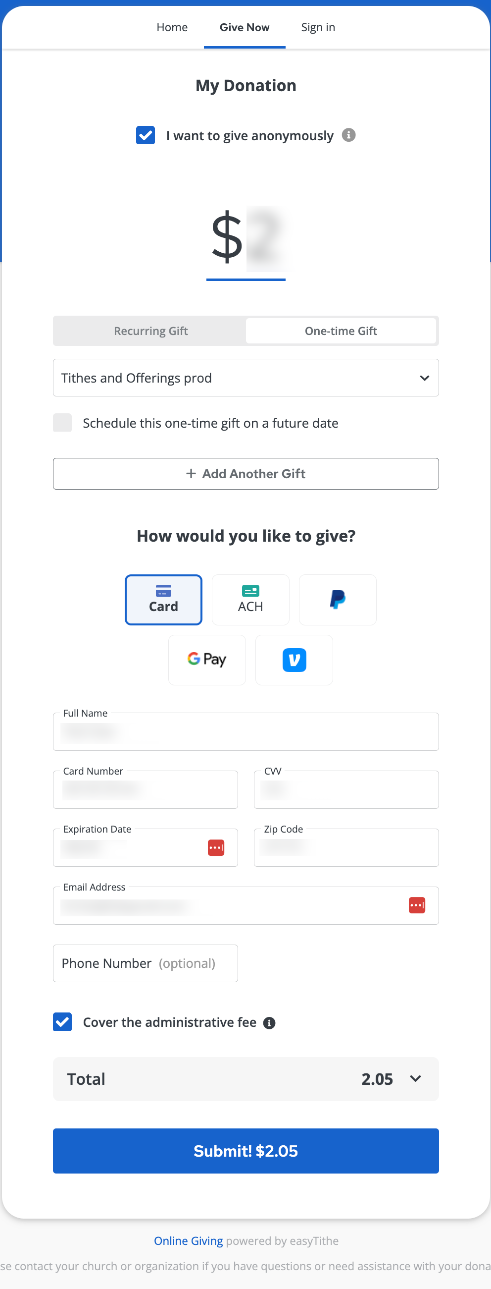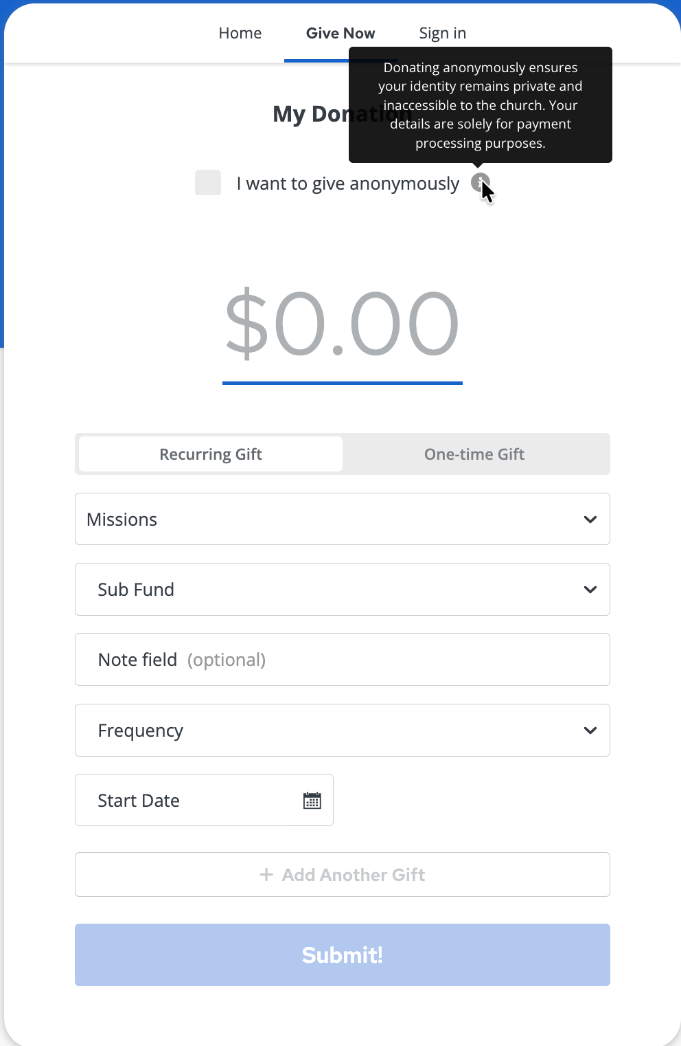 - Didn’t see the anonymous option? Ensure the administrator turned Anonymous Donation on this Giving Form.